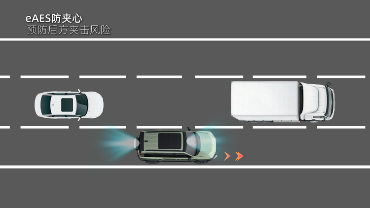 针对高速路段常见的前车急刹、后车紧逼的“夹心碰撞”风险,升级后新增的eAES防夹心功能发挥了重要作用。当车辆行驶中遇到前车急刹导致车速快速下降,且后方车辆快速逼近存在追尾风险时,系统会自动监测旁侧车道是否具备变道条件,若条件允许则规划最优避险路径,辅助车辆平稳变道,有效降低高速拥堵场景下的事故风险。