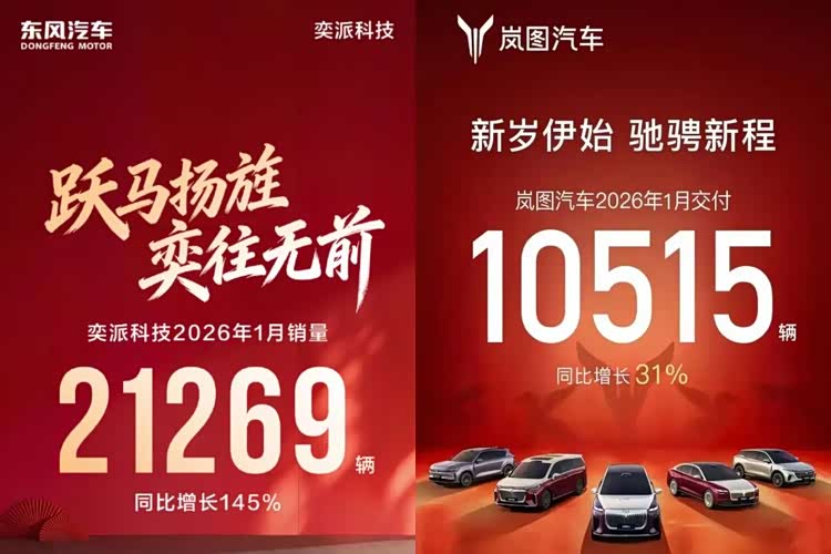 东风汽车集团旗下新能源品牌表现亮眼。奕派科技销量2.13万辆,同比暴涨145%;岚图汽车交付1.05万辆,同比增长31%,连续三年实现1月销量攀升。