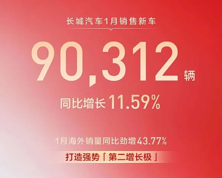 长城汽车1月销量9.03万辆,同比增长11.59%,旗下核心品牌集体实现同比增长,哈弗、魏牌、坦克、长城皮卡分别销售5.05万辆、7873辆、1.45万辆、1.54万辆,新能源汽车销量1.8万辆,海外市场销售4.03万辆,多元化布局成效显现。