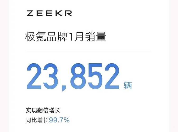 极氪作为吉利旗下高端纯电品牌,1月交付2.39万辆,同比增长99.7%,依托吉利的供应链体系和技术储备,持续保持高速增长,上半年即将上市的极氪8X将进一步丰富产品线,强化市场竞争力。
