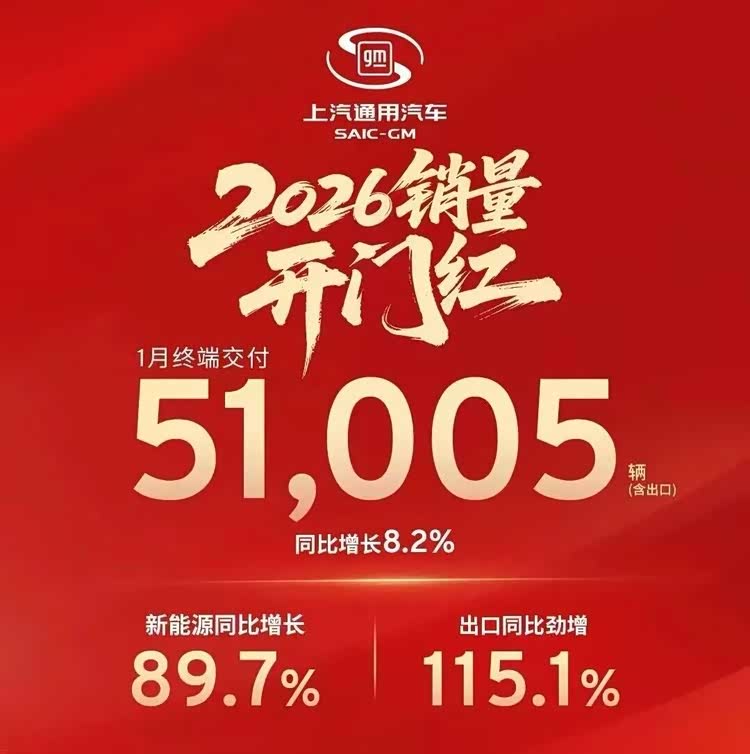上汽通用凭借新能源转型和出口增长打破增长瓶颈,展现出复苏态势。1月上汽通用终端交付5.1万辆,同比增长8.2%,摆脱了此前的销量低迷局面,核心亮点在于新能源业务的爆发式增长和出口业务的突破。