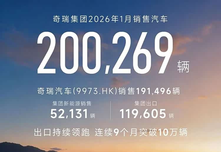 奇瑞集团依托出口优势稳居第一梯队,“出口+新能源”双轮驱动的格局稳固。1月奇瑞集团总销量20.03万辆,虽同比下降10.7%,但核心竞争力并未削弱,其中出口销量高达11.96万辆,同比增长48.1%,连续9个月出口突破10万辆,继续稳居中国汽车出口榜首,海外市场已成为集团不可替代的增长支柱。