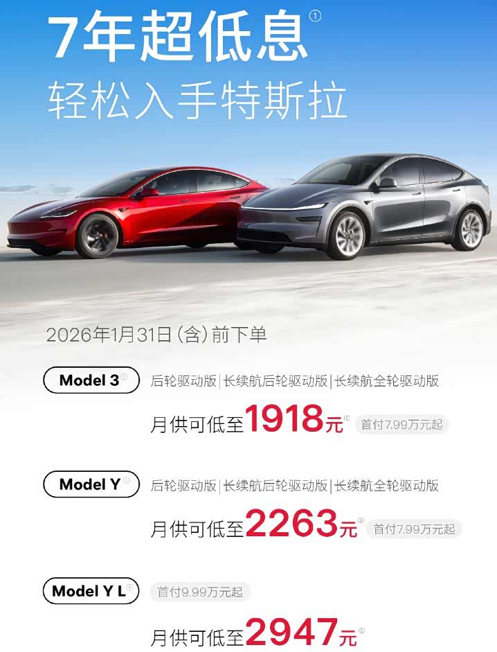 车企们集体转向长期金融政策,其实是有迹可循的。回顾2025年的市场,一个标志性的事件是,比亚迪在全球纯电动汽车销量上首次超越了特斯拉。面临增长压力的特斯拉,在2026年初便祭出了“七年超低息”和“五年零息”的大招。以一款售价约23万元的Model 3为例,消费者只需支付约8万元首付,后续七年每月还款不到两千元,总计利息仅五千多元,年化利率不到1%,远低于市场普通车贷水平。