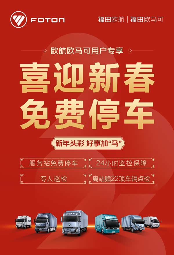 为了让卡友春节回家更踏实,福田欧航欧马可联动服务商,在全国范围内启动“喜迎新春 免费停车”客户关爱服务活动,从北方小年(2月10日)开始,一直延续到正月初八(2月24日),让卡友爱车有处安放。同时,针对春节依然坚守一线的卡友,欧航欧马可将同步启动 “春节不打烊”服务,做用户前行路上的可靠后盾。