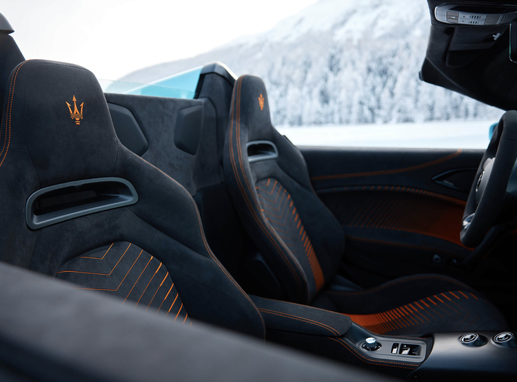 进入车内,玛莎拉蒂MCPURA Cielo FROZEN MAGMA采用了大面积黑色Alcantara面料铺陈,还加入了橙色的手工双缝线设计,还配备了两个赛车桶装座椅,座椅靠背进行了挖空处理,头枕还加入了精工刺绣三叉戟徽标,方寸之间尽彰定制匠心。中控台配备了小尺寸碳纤维赛车方向盘,外部边框还加入了麂皮绒材质,12点方向还加入了回正皮标。随处可见的MCPURA Cielo FROZEN MAGMA ONE OF ONE艺术刺绣和意大利国旗徽标,提升了整车的优雅气质。固定在中控中央的10.25英寸多媒体触控屏幕,内部集成了移动互联功能,再加上按钮式电子换挡和旋钮式的驾驶模式选择,也颇有艺术气息。新车音响由“Sonus Faber”提供,搭载殿堂级的Sonus faber Premium势霸奢华音响系统,这套音响供应商还提供给帕加尼Huayra。