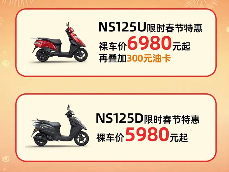 “良驹载福,骑跃新春”,新大洲本田推出了旗下的低价车型,其中NS125D新春特惠价5980元起、NS125U特惠价6980元起、再送300元油卡,那么这两款车怎么样呢?简要来了解一下吧!