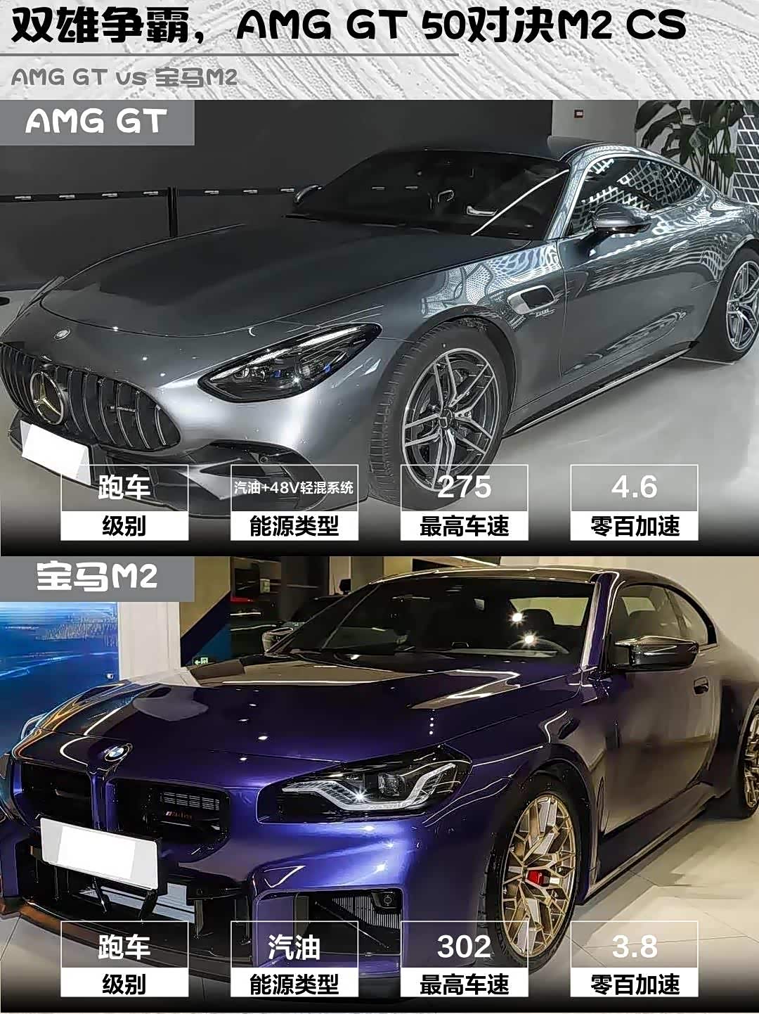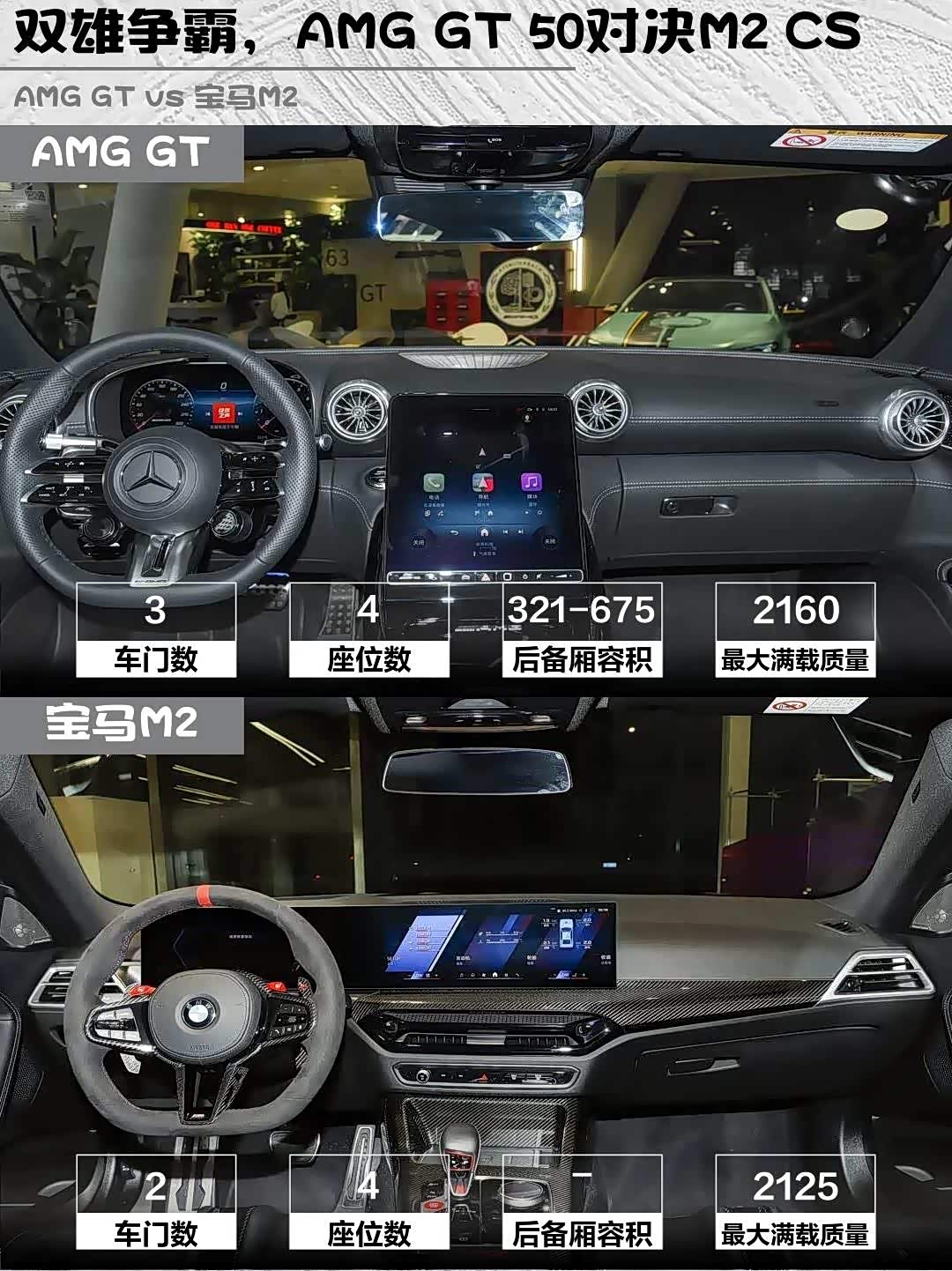 要面子选AMG GT 50,无框车门+四出排气开出去排面足;要纯粹驾驶乐趣必须M2 CS,S58机皇的放炮声能让你嘴角疯狂上扬😏 不过AMG后排还能勉强坐人,M2 CS的后排?那叫宠物专座🐶