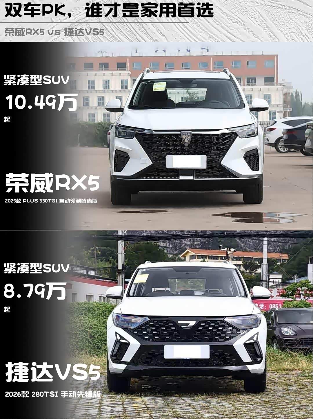 车家号·0浏览·2026-02-04 08:27 · 北京最近后台好多兄弟问我10万级SUV怎么选,今天直接拉出两款热门选手—— 荣威RX5(参数|询价) 2025款 PLUS 330TGI 自动领潮智惠版(10.49万)和捷达VS5 2026款 280TSI 手动先锋版(8.79万)硬核对比!看完这篇你就知道该冲哪台了🔥