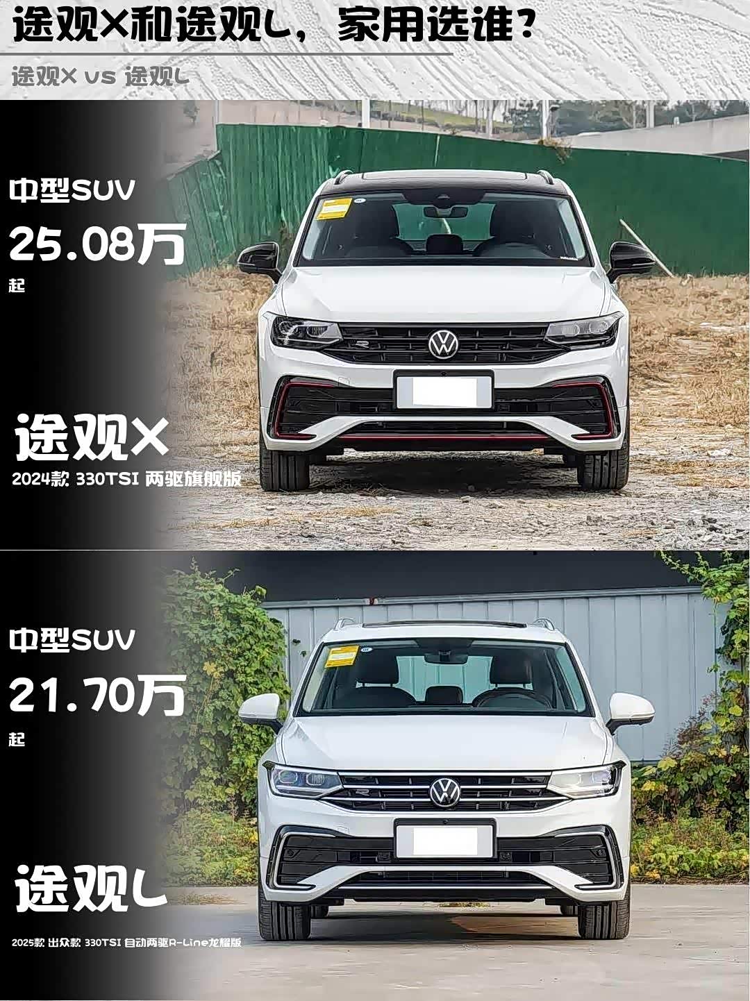 途观X 2024款 330TSI两驱旗舰版这溜背造型真的杀我!20寸大轮毂+极光白车漆,开在路上回头率超高✨ 对比途观L 2025款出众款R-Line龙耀版,虽然都是大众家族脸,但X的跨界设计明显更年轻运动。不过要吐槽下途观X车尾略显单薄,气场不如途观L敦实。