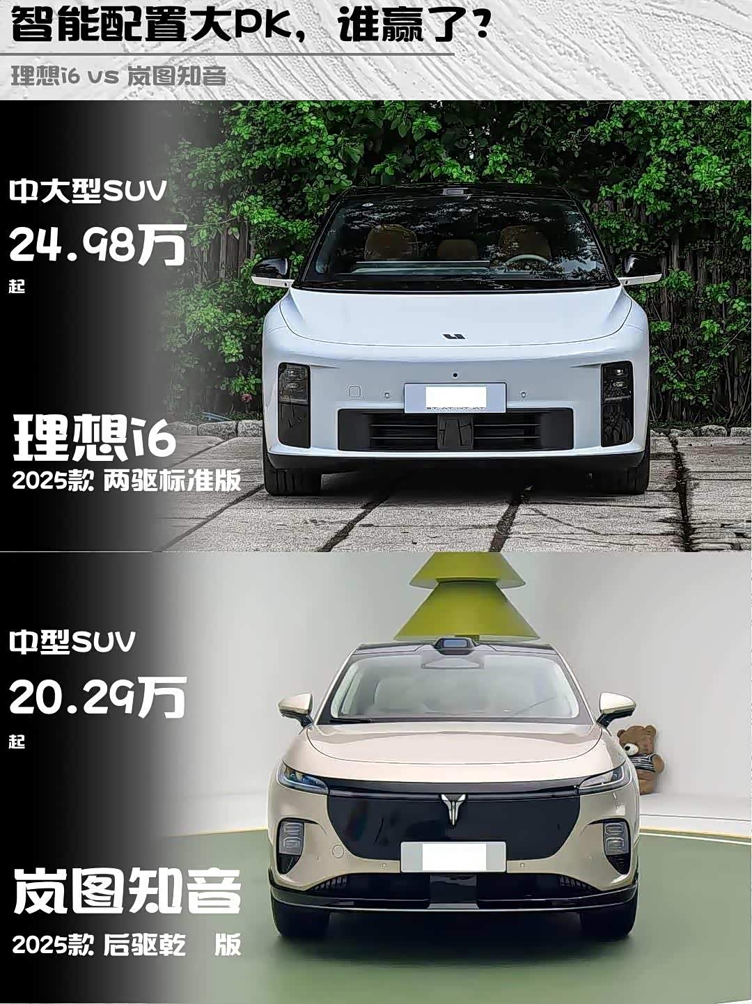 最近后台好多人在问25万级纯电SUV怎么选, 理想i6(参数|询价)和岚图知音这两台热门车到底哪家强?今天直接上干货,拿2025款理想i6两驱标准版(24.98万)和岚图知音后驱乾崑版(20.29万)硬核对比,看完你就知道该冲谁了!🚗💨