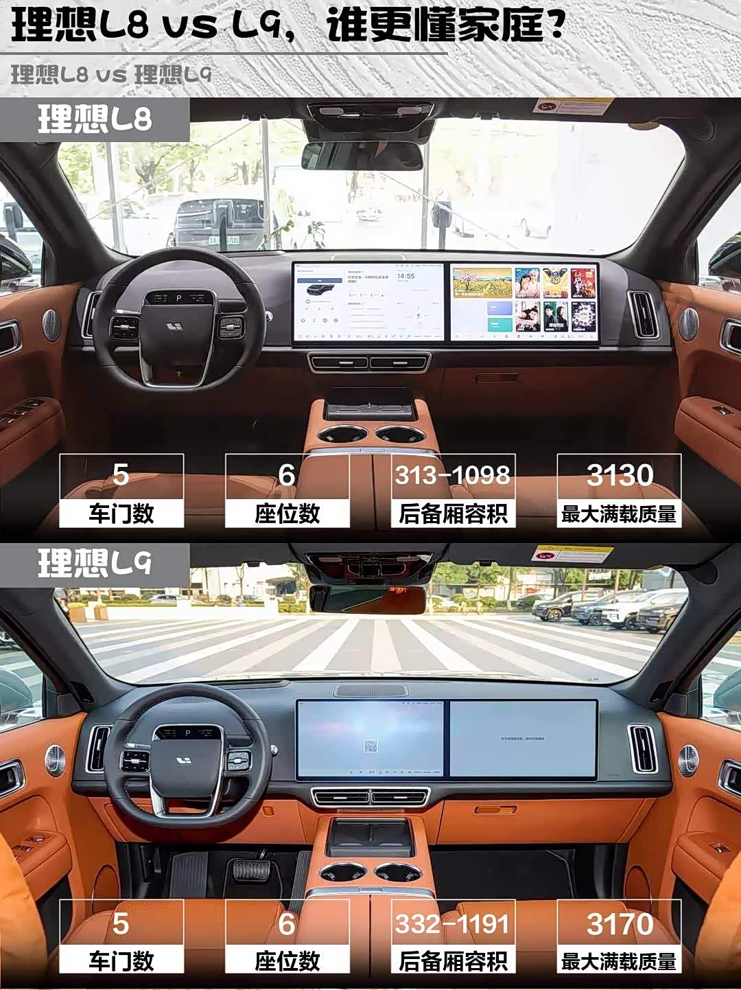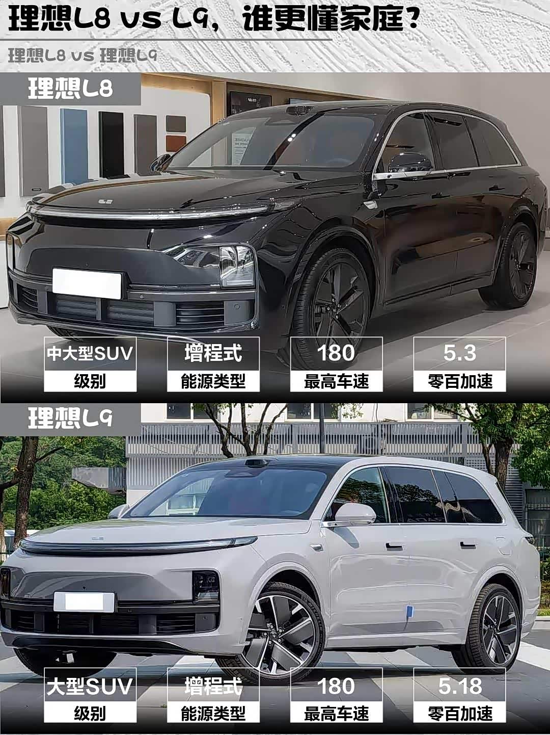 先看核心数据:L8车长5080mm,L9直接拉到5218mm,差了整整一个行李箱的长度!但L8的5.3秒破百和L9的5.18秒实际开起来体感差距不大,都是双电机四驱的猛男💪。不过L9标配21寸大轮毂(L8要选装),底盘还多了魔毯空气悬架2.0,过减速带确实更丝滑~