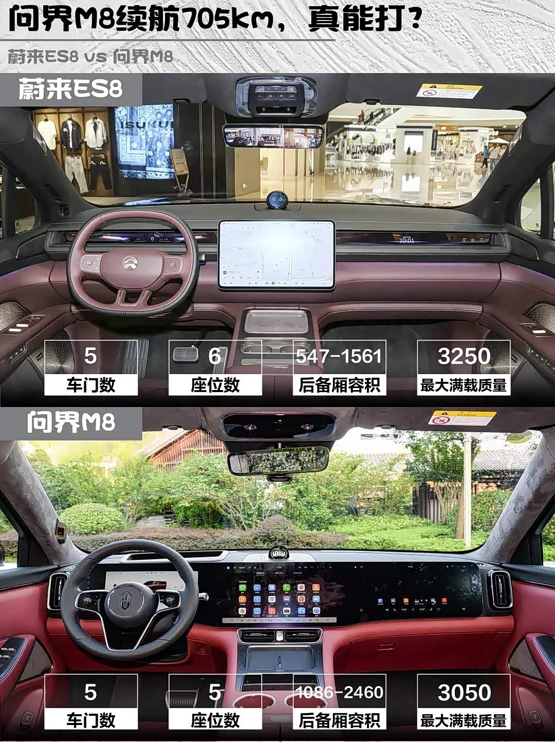 空间布局是最大分水岭👉ES8六座中排带行政中岛,真皮打孔座椅全系通风加热按摩,三排能轻松坐1.75米成人;M8五座后备箱直接干到2460L,露营装备随便塞。实测ES8二排腿部空间比M8多一拳,但M8后排能145度躺平,午休模式吊打。