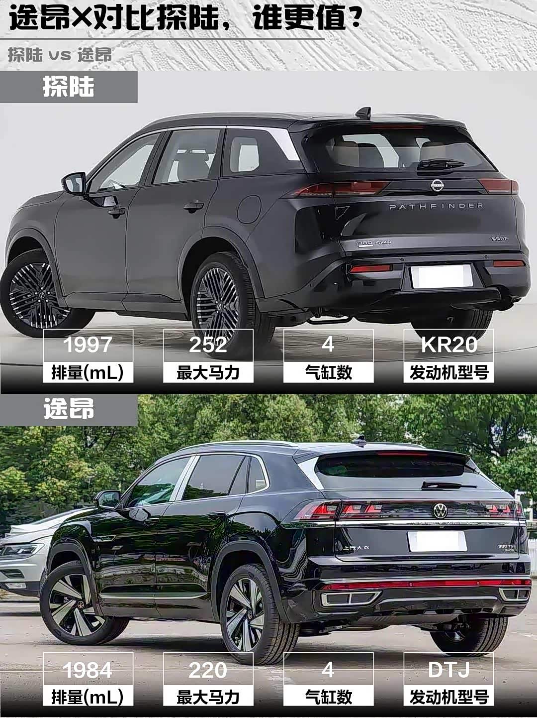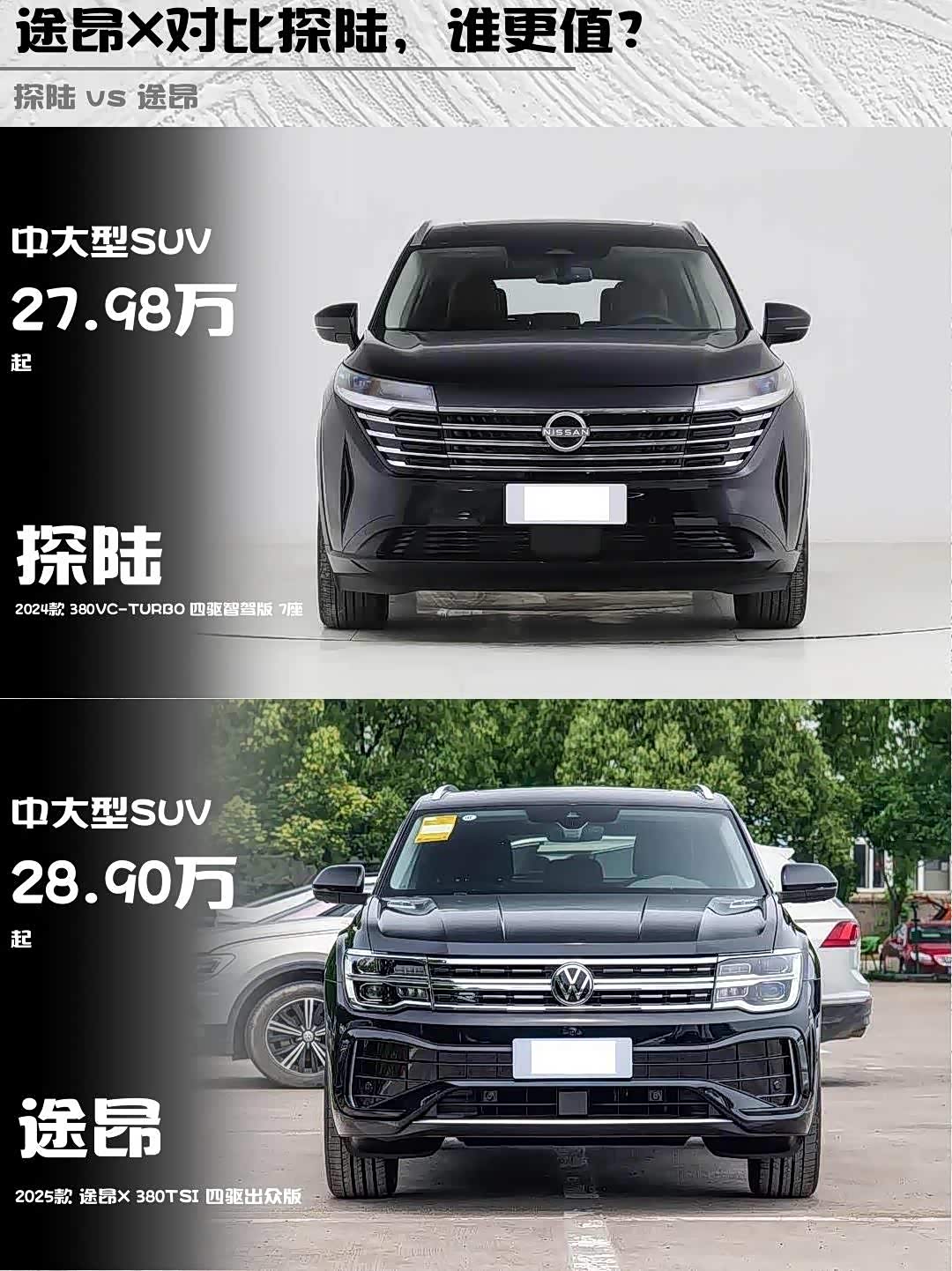 探陆指导价27.98万,终端优惠后25万级;途昂X 28.9万基本没优惠。省下的3万够加两年油了!而且日产保养比大众便宜30%左右,长期持有更划算。💰