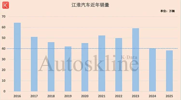 在刚刚过去的2025年,江淮汽车全年销售38.41万辆,首次跌破40万辆,同比减少4.72%,销量创下近10年新低。