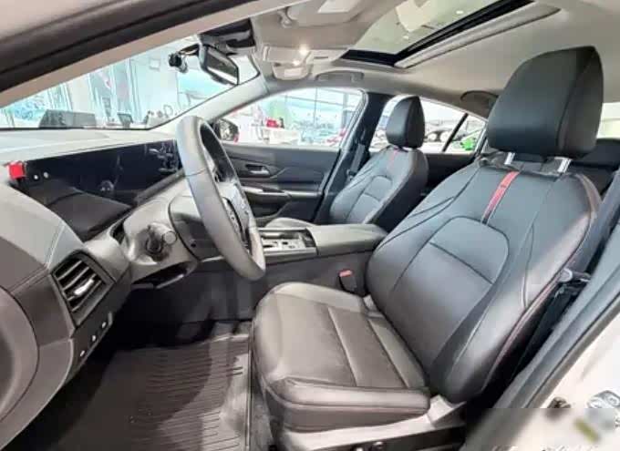 车头还是那副熟悉的V型脸,黑格栅、熏黑轮毂、溜背车顶,连后视镜也刷成了暗色,像给家用轿车套了件赛车服,尾部加了个小尾翼,后保险杠的黑边扰流板像用笔勾了道粗线,一眼看去,比普通版多了点劲儿,轩逸从买菜车,变成了有点脾气的小伙子。