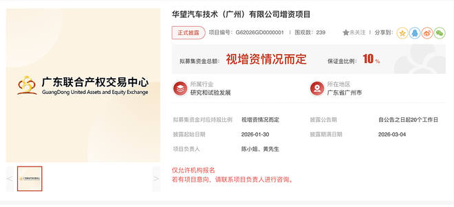 近日,华望汽车在广州联合产权交易中心挂牌,开启新一轮增资扩股,募集到的资金将用于车型开发及渠道建设等方面。
