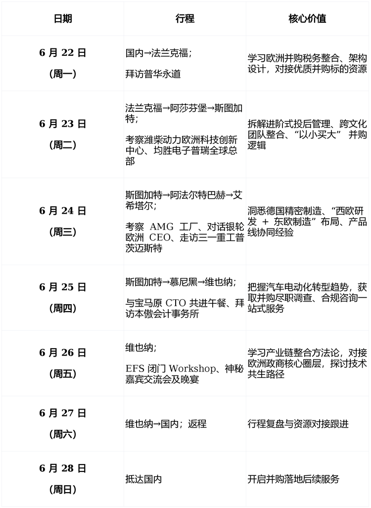 此次课程不是“走马观花”,而是 “并购落地加速器”:1次行程解决从“找标的”到“投后整合” 的全链条痛点,链接从“行业专家”到“欧洲政商”的核心资源。