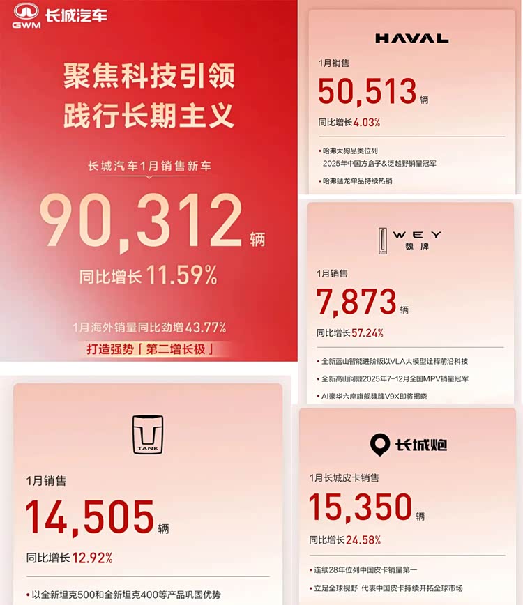 长城这边也不甘示弱,共计销售新车90312辆,同比增长11.59%。作为主销SUV的品牌,确实不简单,主力贡献还是看哈弗,坦克和长城炮也是稳扎稳打。同时海外销量的同比增长也有43.77%。