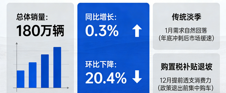 根据乘联会的推算,1月总体市场大概是180万辆,同比增长仅仅0.3%,环比更是下降得厉害,估计会降个20.4%。一方面是因为,1月本来就是传统淡季,毕竟经历了年底的冲刺任务,1月是要缓一缓,但今年还多加了一个购置税补贴退坡的因素,导致12月冲得比以往更猛,提前透支了1月的消费力。