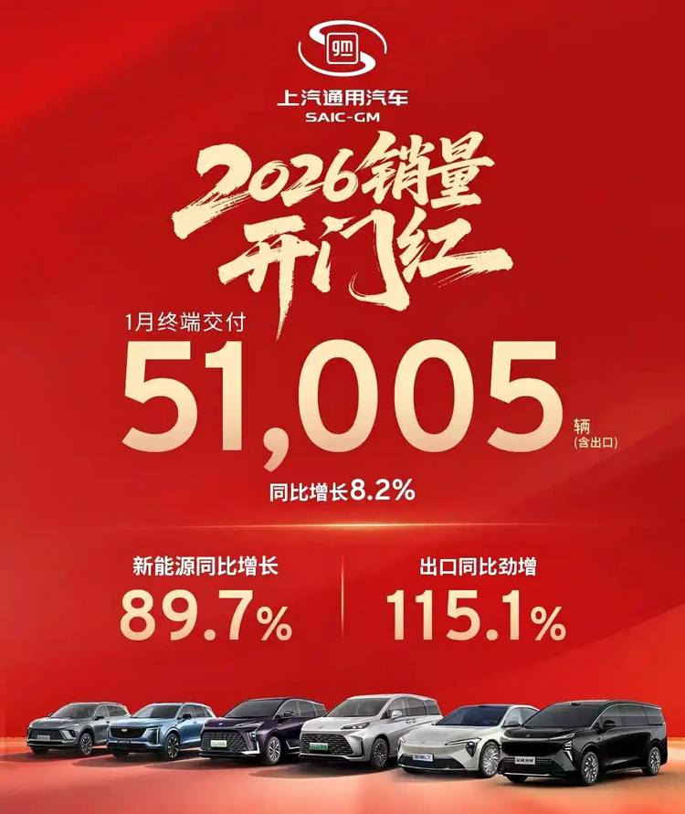 再来看几个合资阵营的表现。上汽通用汽车在1月的终端交付为51005辆,同比增长8.2%,新能源同比增长89.7%,出口同比增长115.1%,说明新能源渗透率在上涨,且海外市场也是重点发力。