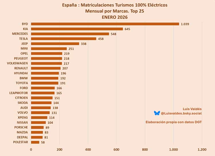 2026 年 1 月西班牙电动汽车销量出炉,比亚迪登顶品牌销量排行榜、Jeep销量暴涨、特斯拉回血!