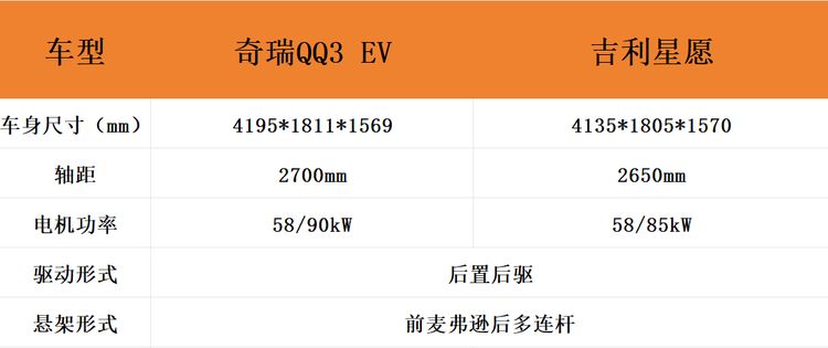 车身尺寸方面,这车长度为4195mm,轴距为2700mm。和吉利星愿对比,后发优势相当明显。全系都是单电机后驱,低配动力为58kW,和星愿一样。高配动力为90kW,比星愿的85kW略高一点,但是和名爵MG4极狐T1相比的话,还是逊色一点的。然后底盘是四轮独立悬挂,与星愿保持一致。