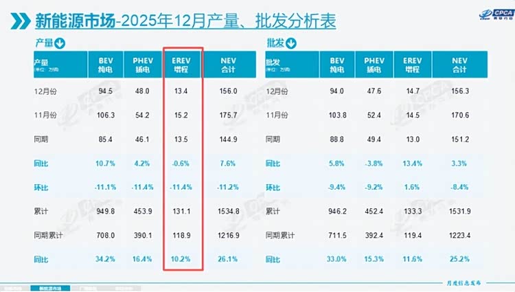 从乘联会的数据中可以看出,在2025年,增程车累计销量达131.1万辆,同比增速仅为10.2%,而纯电车型的销量达949.8万辆,同比增长高达34.2%。