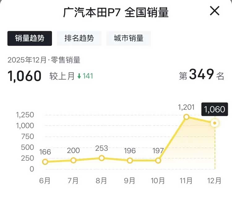 从2025年11月、12月的销量数据来看,广汽本田P7销量虽终于突破千辆,迈入月销四位数行列,但这样的成绩放在竞争激烈的新能源市场中,依旧难言理想。这也不禁让人疑问:那些原本等待P7降价后入手的潜在用户,最终为何选择了观望或转向其它品牌呢?