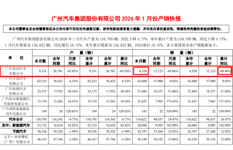 更为尴尬的是,广汽集团1月份产销快报显示,旗下广汽传祺、广汽埃安、广汽领程三家自主品牌,以及另一合资伙伴广汽丰田,1月份销量均实现正增长,唯有广汽本田销量暴跌,反而成为拖累集团整体发展的“拖油瓶”,与兄弟品牌的强势表现形成鲜明反差。