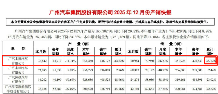 数据显示,2025年广汽本田全年销量为351900辆,同比下滑25.22%,整体销量下滑的颓势并未得到扭转,反而持续承压。