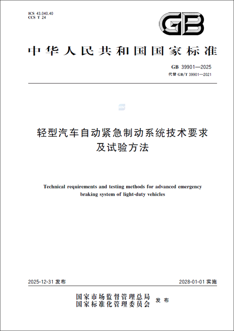 2025年12月31日,工业和信息化部组织修订的强制性国家标准《轻型汽车自动紧急制动系统技术要求及试验方法》(GB39901一2025),经国家市场监督管理总局、国家标准化管理委员会批准发布,将于2028年1月1日正式实施。该标准由推荐性国家标准GB/T39901一2021《乘用车(884099)自动紧急制动系统(AEBS)性能要求及试验方法》修订而来,是我国在汽车驾驶辅助系统领域的首个强制性国家标准,标志着轻型汽车自动紧急制动系统将从“选配”走向“标配”,并具备统一、规范的安全性能基准。