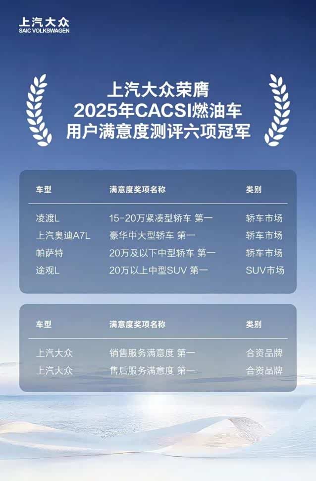 在2025“服务质量年”,上汽大众通过广泛收集用户声音、推动服务数字化转型等举措,强化直连用户,优化全生命周期体验。大众品牌推出“一客一群”数字化专属服务模式、行业领先的“整车终身质保”政策、透明的“一口价”购车方案,带给用户全流程的省心、放心与安心。高品质服务收获用户口碑。在2025年的CACSI测评(中国汽车行业用户满意度指数)中,上汽大众大众品牌荣获合资品牌销售服务与售后服务双料冠军。