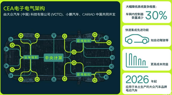 1月28日,大众中国宣布其专为中国市场打造的CEA电子电气架构已如期完成交付,这是大众汽车(中国)科技、CARIAD中国与小鹏汽车合作的关键成果。据大众汽车集团(中国)董事长兼首席执行官贝瑞德介绍,自2026年起,国产大众汽车品牌的纯电动车型将搭载全新的CEA电子电气架构——China Electronic Architecture。