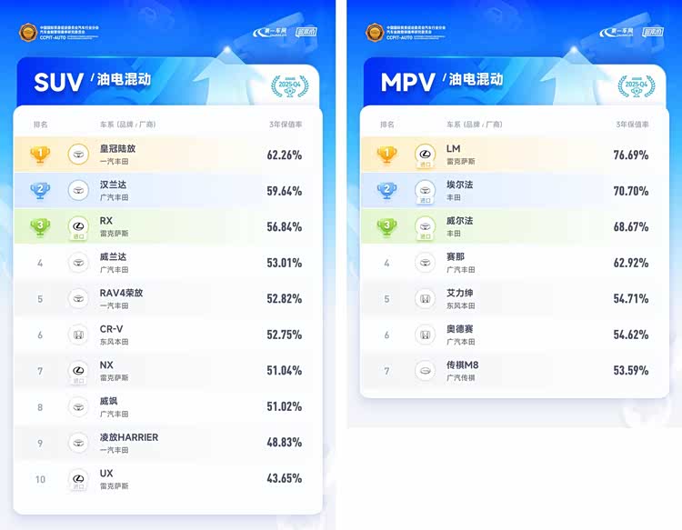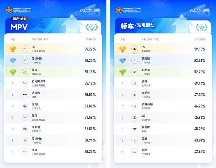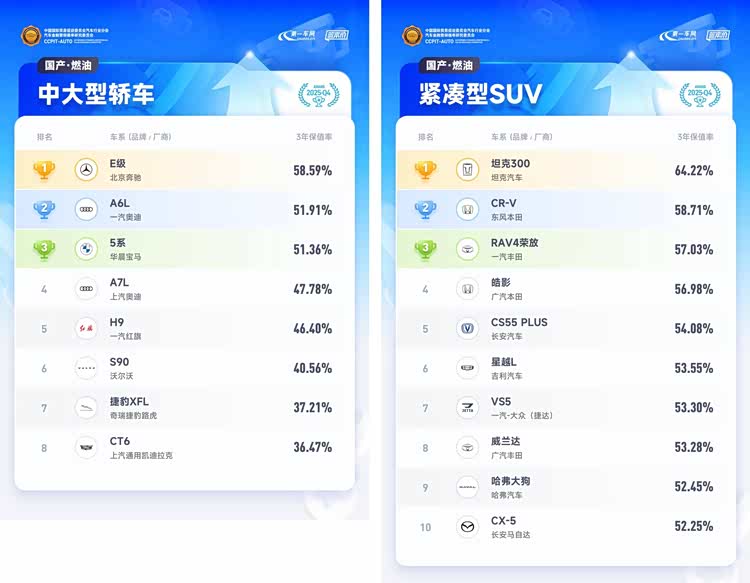 从具体车系看,在燃油车领域,雅阁、凯美瑞、亚洲龙分别以54.43%、53.26%、51.94%的3年保值率位列国产中型轿车排行榜前三名; 坦克300(参数|询价)凭借其消费者的高认可度,以64.22%的3年保值率稳居国产紧凑型SUV排行榜榜首,紧随其后的是本田CR-V和丰田RAV4荣放,两者的3年保值率分别为58.71%、57.03%;国产中大型SUV排行榜中福特探险者蝉联第一,其3年保值率为57.42%,大众途昂稳居亚军,保值率为54.33%;MPV市场标杆别克GL8,凭借55.27%的3年保值率,蝉联6年国产MPV排行榜冠军。
