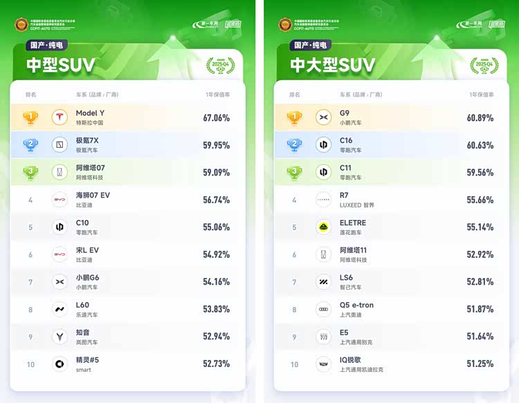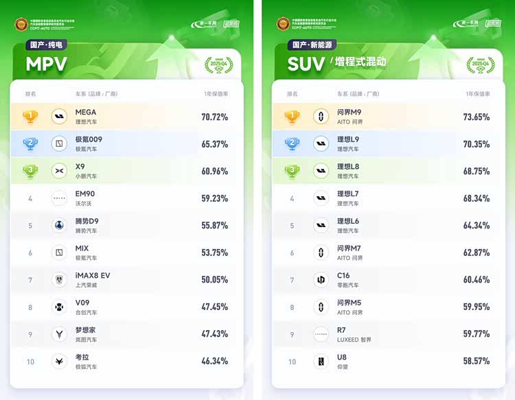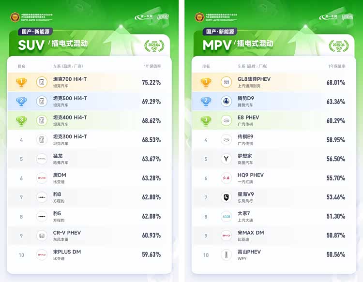 新能源车方面,在政策引导下加速技术升级,固态电池、800V超充等技术进入量产阶段。小米SU7凭借强劲的市场表现,以70.22%的1年保值率登顶国产纯电中大型轿车排行榜;特斯拉Model 3、Model Y两款车型分别凭借68.44%、67.06%的1年保值率排在国产纯电中型轿车、国产纯电中型SUV排行榜首位;理想MEGA以较大优势摘得国产纯电MPV排行榜冠军,其1年保值率为70.72%;GL8陆尊PHEV则以68.01%的1年保值率在国产插电式混动MPV排行榜中登顶冠军;秦PLUS DM、汉DM和UNI-V智电iDD位居国产插电式混动轿车排行榜TOP3,1年保值率分别为58.68%、58.68%、57.94%;坦克系列包揽国产插式电式混动SUV排行榜前三名,坦克700Hi4-T、坦克500Hi4-T、坦克400Hi4-T的1年保值率分别为75.22%、69.29%、68.62%。