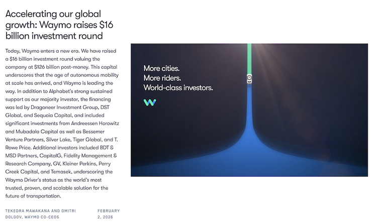 这轮融资较Waymo上一轮飙涨了近3倍,不仅是全球自动驾驶领域史上规模最大的一笔投资,更让Waymo的投后估值飙升至1260亿美元(约合人民币8741亿元),较上一轮450亿美元估值暴涨180%。