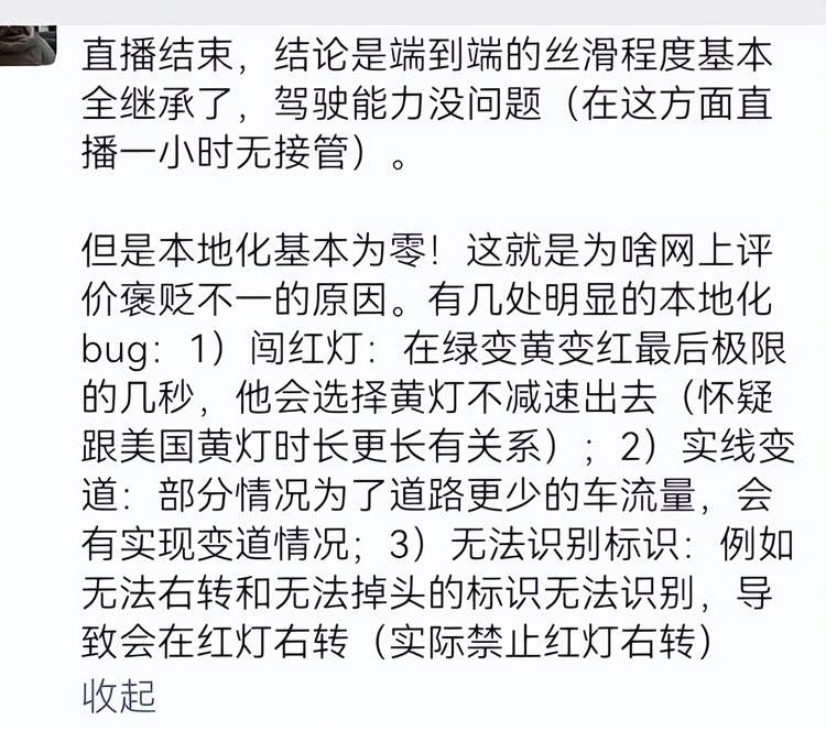 一位特斯拉的车主进行了一小时的直播后表示,“端到端的丝滑程度基本完全继承了,驾驶能力没问题,但是本土化基本为0”。
