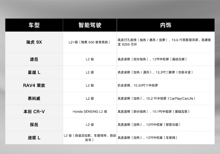 在智能化日益普及的今天,车机算力与智驾能力已成为选车的重要分水岭。合资阵营的探岳、RAV4等车型,虽然配备了L2级辅助,但车机功能相对基础,屏幕尺寸也多停留在10-12英寸。星越L虽然搭载了8155芯片,但在智驾的高阶功能上与瑞虎9X仍有细微差距。
