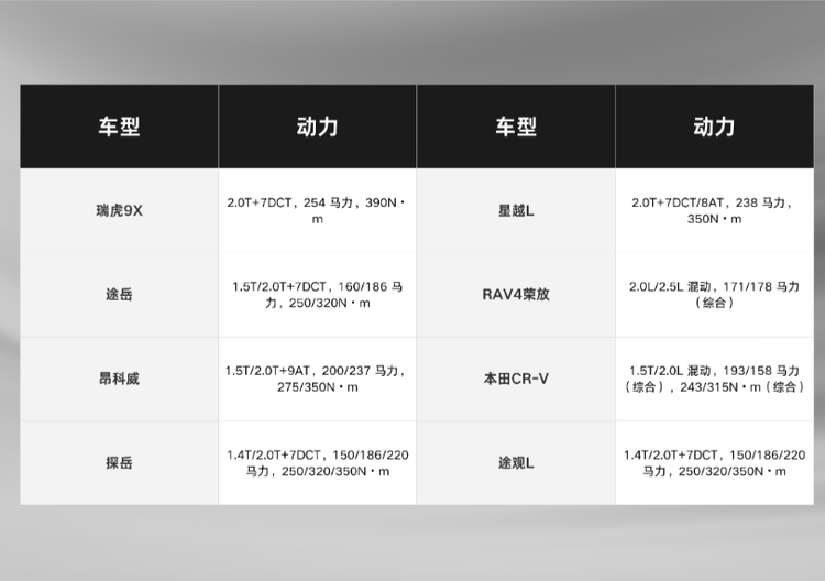 动力系统是汽车的心脏,直接决定了驾驶的底气。纵观这8款车型,日系的CR-V和RAV4荣放多采用1.5T或自吸匹配CVT,主打平顺省油,但急加速时的咆哮与乏力感难以避免。德系的途岳、探岳主力车型多为1.5T或低功率2.0T匹配双离合,虽然传动效率高,但低速顿挫感依然存在。昂科威与星越L虽有2.0T加持,但在变速箱匹配上各有侧重。相比之下,瑞虎9X在三大件上展现出了旗舰级的诚意。它全系搭载了“鲲鹏2.0TGDI发动机+第二代8AT”的黄金动力组合。这台获“中国心”十佳称号的发动机,峰值扭矩高达390N·m,动力储备深不见底。更关键的是第二代8AT变速箱的加入,不仅换挡逻辑丝滑,更在燃油经济性与动力响应之间找到了完美平衡。在15万级的价位中,能同时给到高功率2.0T与8AT变速箱的车型屈指可数,瑞虎9X无疑在机械素质上占据了制高点。