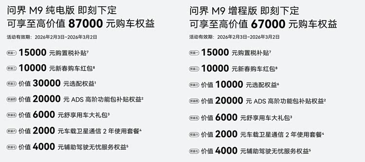 此次优惠政策表明:即日起至3月2日,下定问界M9至高可享87000元购车权益,包含购置税补贴、购车红包及ADS高阶功能包补贴等多重礼遇。这不仅是真金白银的购车优惠,更是对用户选择智慧豪华出行方式的实质性回馈,让科技豪华体验真实可感、触手可及。
