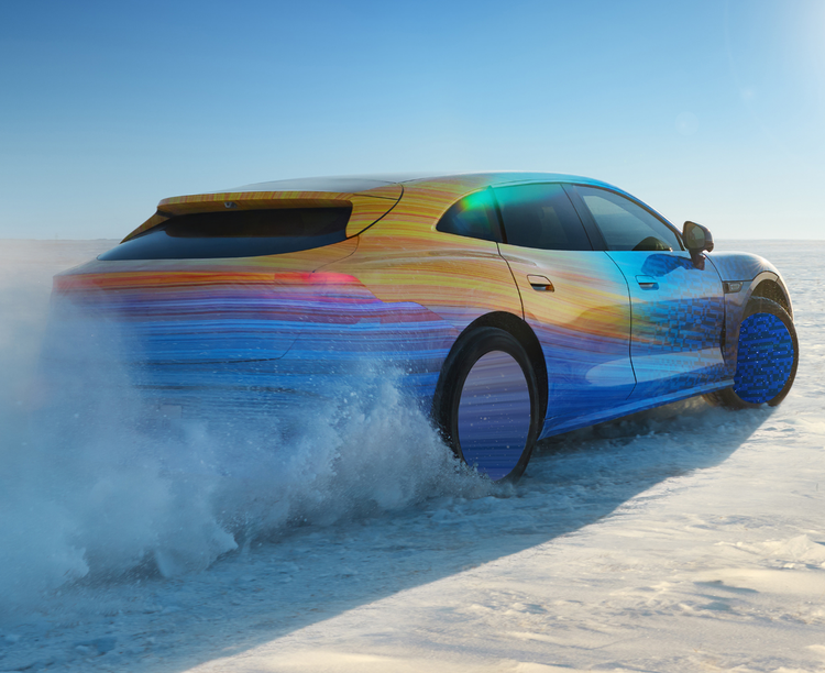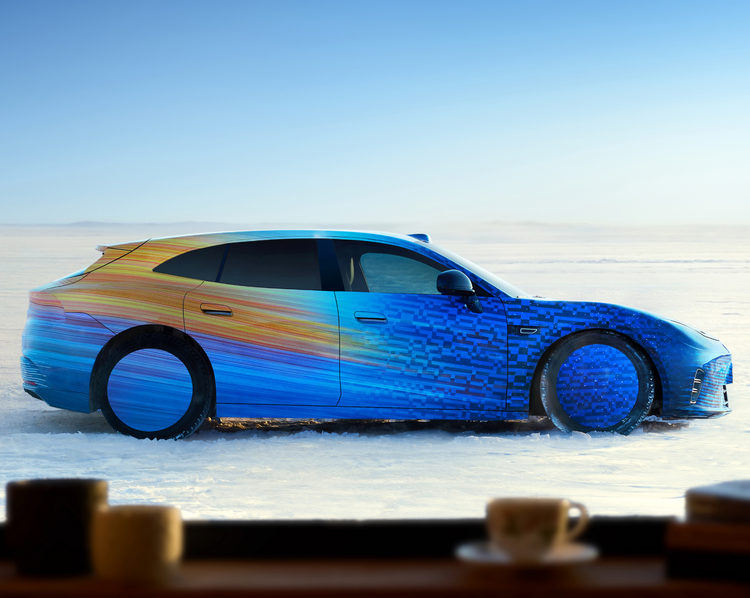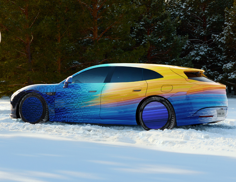 前机盖有两条微微隆起的肌肉线条,车顶是凸起的激光雷达。侧面看车辆的前悬、后悬设计得都比较短,前叶子板处设计有一条竖置的熏黑饰条,门把手采用了隐藏式布局,C柱加入了一块车身同色的装饰面板。车尾配备“C”字形尾灯,配备有外挂式小背包,下包围样式很粗犷。