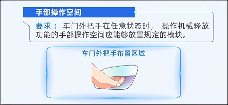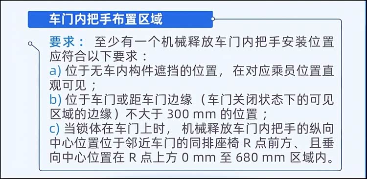 根据标准,新规的核心要求可以归纳为“双机械、易识别、够结实”。每个车门(尾门除外)必须配备具有机械释放功能的外把手和内把手。这意味着无论车辆是否断电、电子系统是否失灵,物理的“开门”动作必须得到保障。