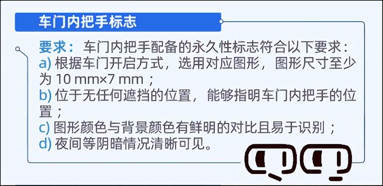 车内把手必须配备永久性、尺寸不小于10mm×7mm的清晰标志,确保在任何光线条件下都能被快速找到。新规甚至细致到要求手部操作空间必须足够,能够容纳规定尺寸的模块,以防在事故变形后仍能施力。