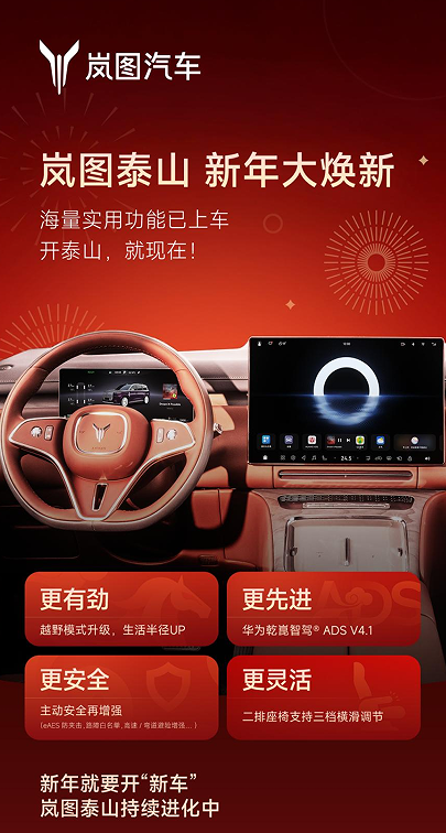 2026年2月4日,岚图汽车向 岚图泰山(参数|询价)车主正式推送首次重大OTA升级!此次升级以华为乾崑智驾ADS 4.1为核心,覆盖智能座舱、辅助驾驶、越野性能三大维度,用“商务+越野”双场景差异化优势,直接改写高端商务SUV的价值规则。