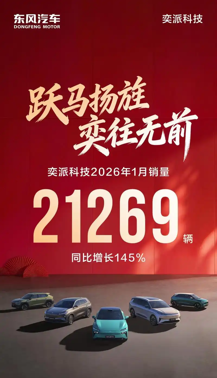 东风汽车集团旗下奕派科技1月销量为2.13万辆,同比增长145%。按照规划,2026年与华为合作的奕境会加入市场,奕派品牌和风神品牌会推出大量新品。