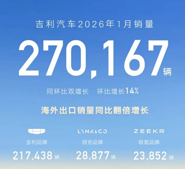 吉利控股一月乘用车销量为270167辆,同比增长1%,环比增长14%,吉利汽车销量实现同环比双增长,新能源销量12.4万辆,海外出口销量同比翻倍增长。 其中,1月新能源车销量124252辆,同比增长3%。具体来看,吉利中国星1月销量134448辆,环比增长高达86%;吉利银河品牌1月销量82990辆;领克品牌1月销量28877辆,其中新能源车型销量17410辆,新能源销量同比增长12%;极氪品牌1月销量达23852辆,销量实现同比增长99.7%大幅度增长。另外,吉利汽车1月海外出口销量60506辆,环比增长50%,同比增长121%。27.02万辆的销量背后,是吉利体系韧性、多品牌协同与全球化布局的综合体现。在行业普遍承压的1月,这份“双正增长”的成绩单显得格外亮眼。