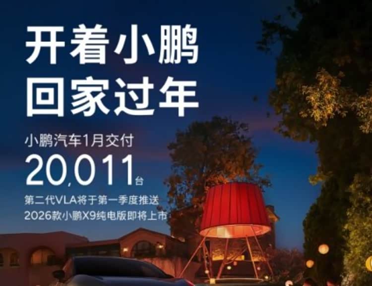 小鹏汽车公布1月交付数据,共交付新车20011台。1月,小鹏X9单月交付4219台,同比增长413.9%。同月,2026款小鹏X9纯电版开启预订,即日起至新车上市前,支付2000元意向金可抵7000元购车款。