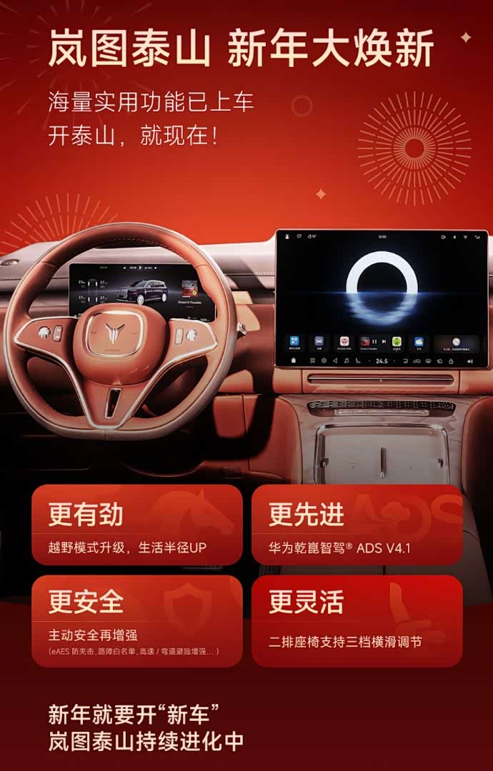 2月4日,岚图汽车向 岚图泰山(参数|询价)车主正式启动首次重大整车OTA升级。此次升级以华为乾崑智驾ADS 4.1为核心抓手,覆盖智能辅助驾驶、越野性能、智能座舱三大核心维度,打破高端商务SUV“城市专属”的固有标签,用“商务+越野”的双场景全能表现,为高端用户带来更具温度与实力的出行解决方案。