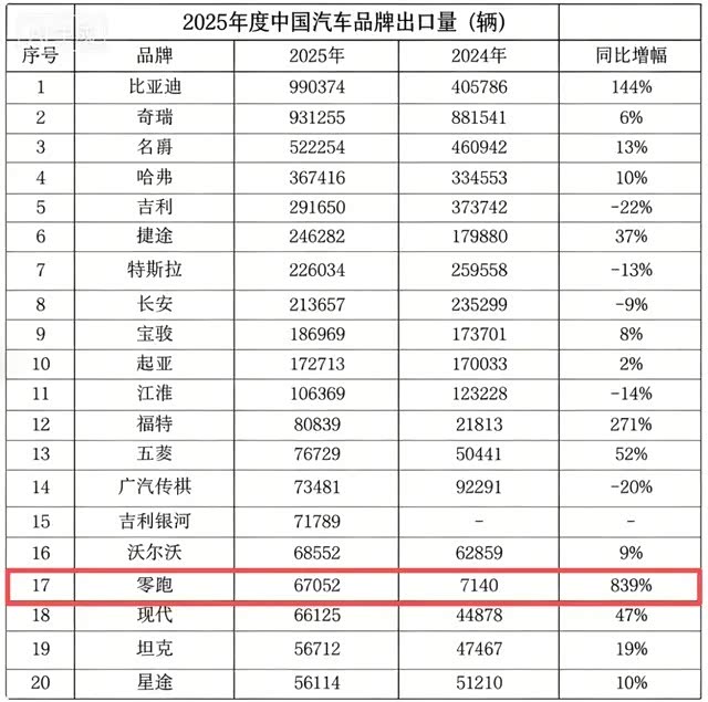 2025年,零跑汽车以839%的同比增幅成为年度“增长王”,出口量从2024年的7140辆跃升至67052辆,成为造车新势力的“出口王”。