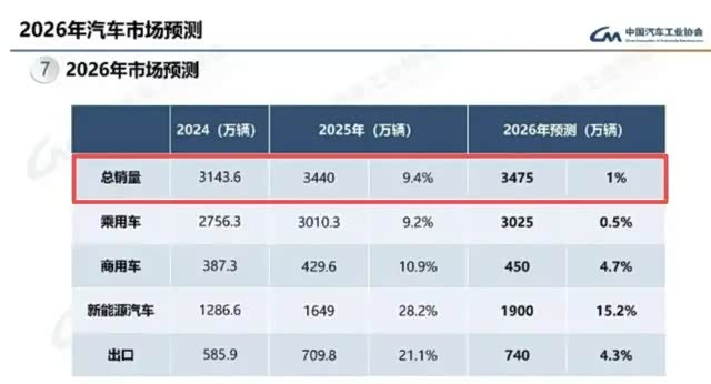 根据中汽协的预测,2026年中国汽车总销量为3475万辆,同比增长1%。